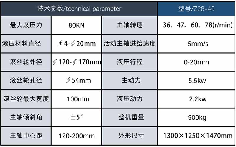 ????????? z28-40型滾絲機(jī)的主要用途本機(jī)器主要用于各種外螺紋、包括普通螺紋、梯形螺紋及模數(shù)螺紋、也可對(duì)工進(jìn)行成形、滾光、滾紋等滾壓加工。適應(yīng)于滾壓的材料為延伸率大于10%,抗壓強(qiáng)度小于100kgf/m㎡的各種碳素鋼、合金鋼及有色金屬。